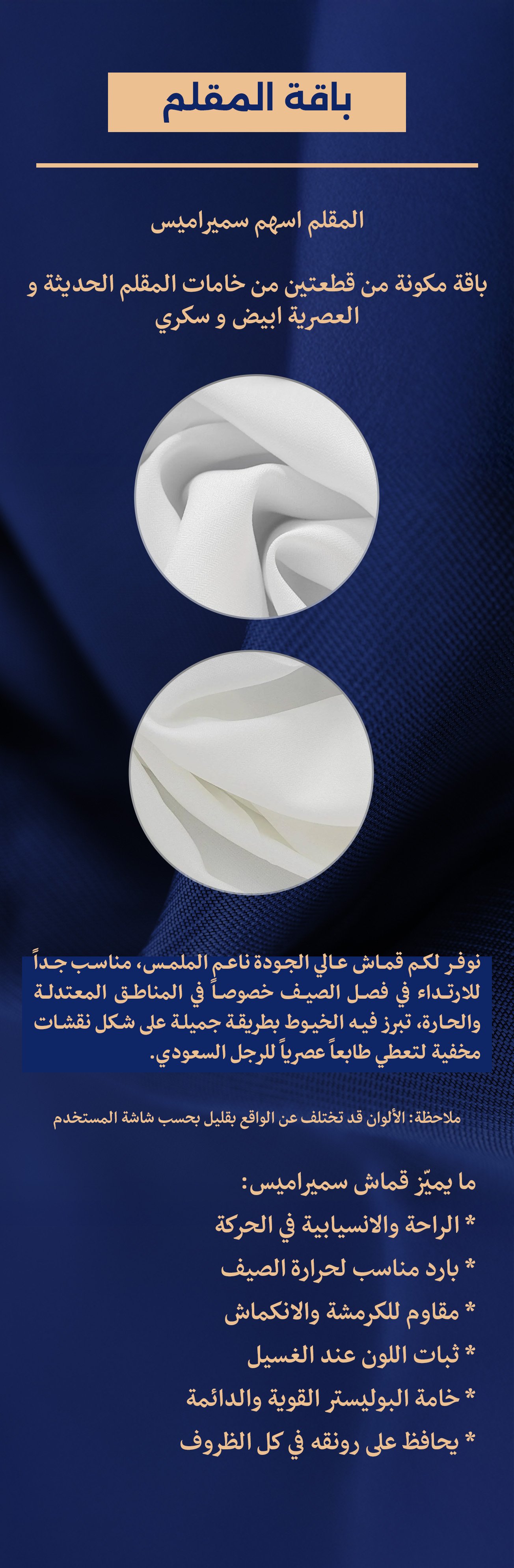 نوفر لكم قماش عالي الجودة ناعم الملمس، مناسب جداً للارتداء في فصل الصيف خصوصاً في المناطق المعتدلة والحارة، تبرز فيه الخيوط بطريقة جميلة على شكل نقشات مخفية لتعطي طابعاً عصرياً للرجل السعودي.