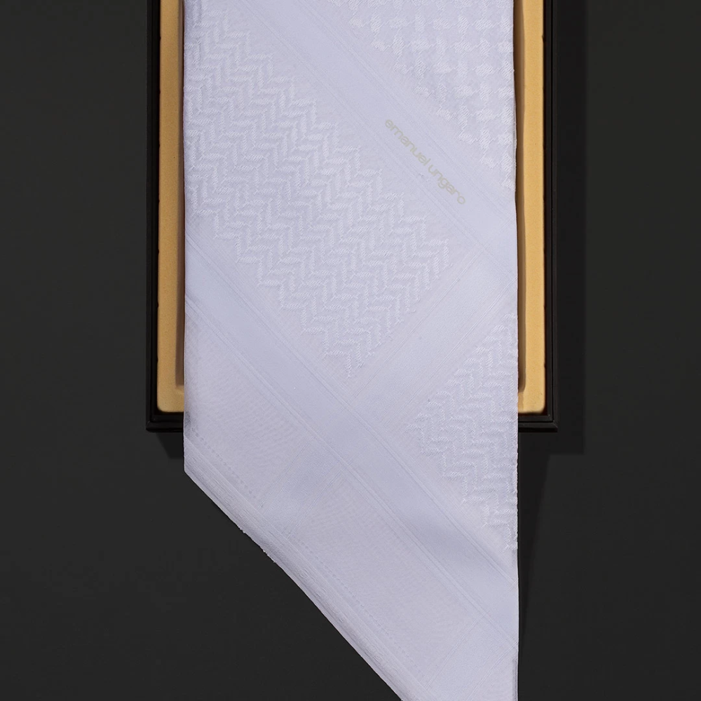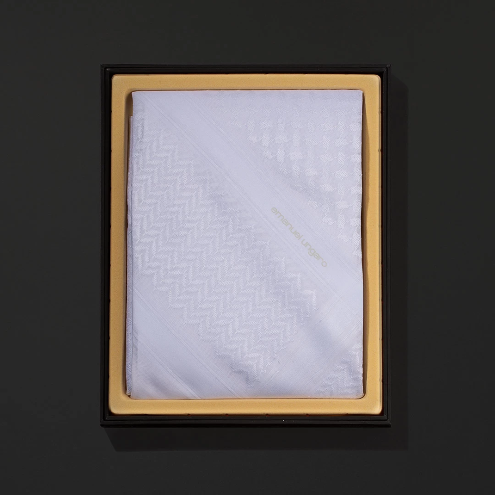 شماغ ابيض فاخر من ماركة ايمانويل انقارو Emanuel Ungaro، شماغ انجليزي فاخر مصنوع من افخر انواع القطن العالمي لتضفي على شكله مزيد من الأناقة والوقار والتميز. وتتميز أطراف الشماغ بأنها متطابقة ومحكمة بطريقة دقيقة تزيد من كمال مظهر الشماغ وجماله