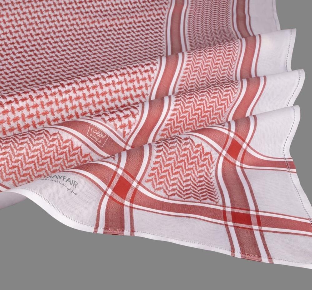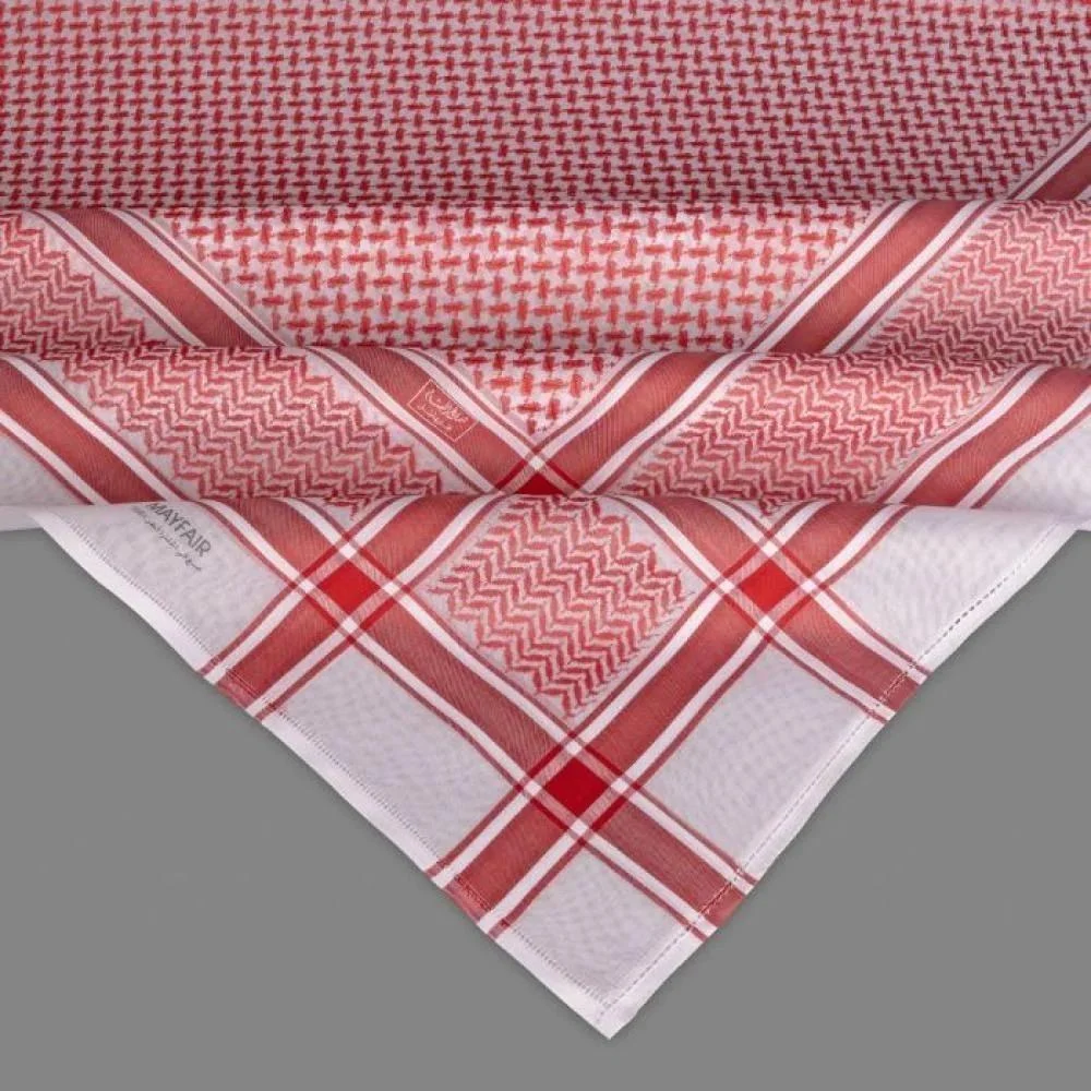 - يظهر النسيج متجانسًا مع اللون الأحمر الداكن والأبيض الناصع ليمثل الروح العربية الأصيلة في الشماغ التقليدي.